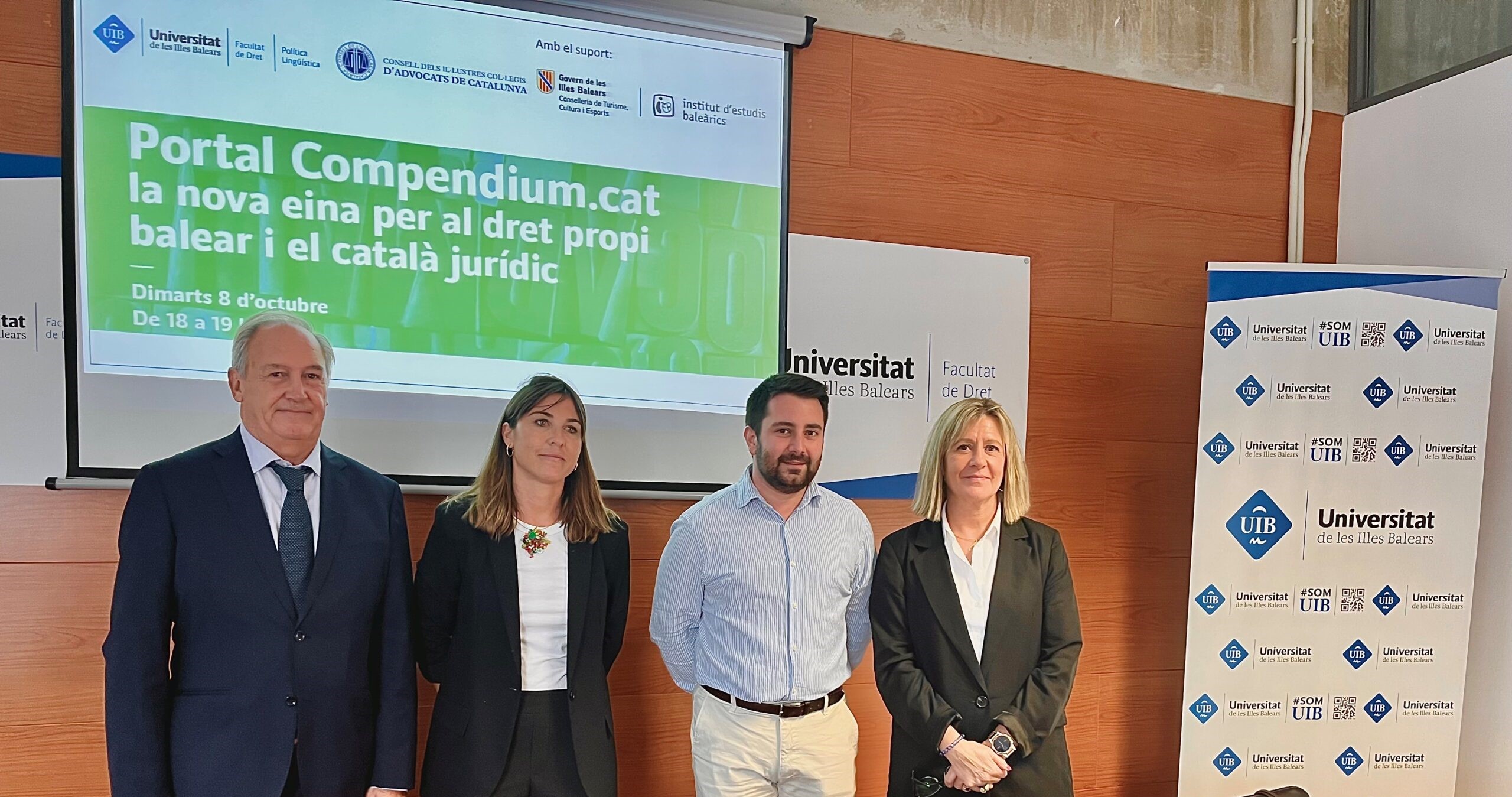 La Facultat de Dret de la Universitat de les Illes Balears va ser l’escenari, el passat 8 d’octubre, de la presentació dels nous recursos de dret propi balear que s’han incorporat al portal Compendium.cat. D’aquesta forma, els professionals i estudiants del Dret a les Illes, el personal d’administracions i institucions o qualsevol professional que treballi en català tenen al seu abast aquesta eina gratuïta que aplega un miler de recursos sobre llenguatge jurídic en llengua catalana, entre els quals n’hi ha del dret propi de Mallorca, Menorca, Eivissa i Formentera, que s’ampliaran en els pròxims mesos.