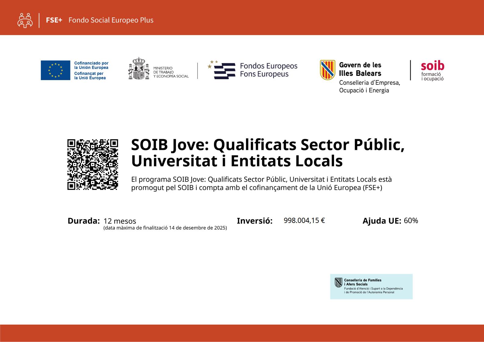 Promovido pelo SOIB y con la cofinanciación de la Unión Europea con el Fondo Social Europeo Plus (FSE +) en el marco del Programa FSE + de la Comunidad Autónoma de las Illes Balears 2021-2027, se concedió una subvención por el importe de 998.004,15€ para contratar a 26 personas del Módulo A y a 15 personas del Módulo B. El objeto de este subvención es financiar los costes laborales para la contratación de personas jóvenes desempleadas mayores de 18 años y menores de 30 años mediante contrato formativo para obtener la práctica profesional adecuada al nivel de estudios cursados, a jornada completa y con una duración de 12 meses.