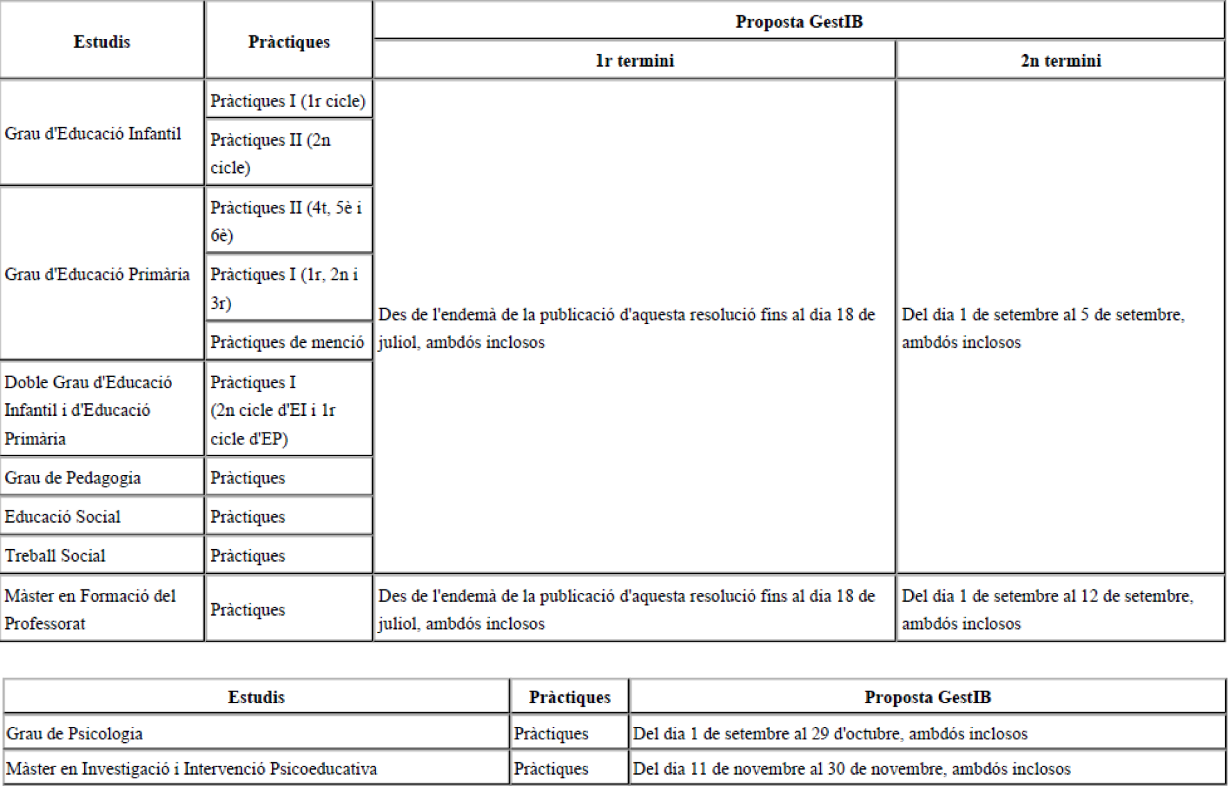 Día 24 de junio de 2024 se ha publicado al BOIB la Resolución del director general de Universidades, Investigación y Enseñanzas artísticas Superiores de 18 de junio de 2025 por la cual se convocan a los centros educativos de las Illes Balears para que acojan estudiantes en prácticas de estudios de la Universitat de les Illes Balears (UIB).