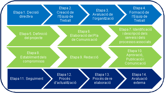 La Direcció General de Comunicació i Govern Obert vetlla per l'homogeneïtat i la coherència metodològica del procés d'elaboració de les cartes. Per això, s'encarrega d'elaborar instruccions i guies metodològiques i també de donar el suport tècnic i la formació necessaris al llarg del procés d'elaboració de la carta.