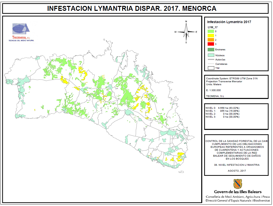 Mapa d' afectació Lymantria dispar Menorca 2017