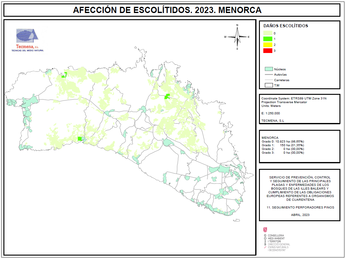 Mapa d'afectació perforadors pi. Menorca 2023