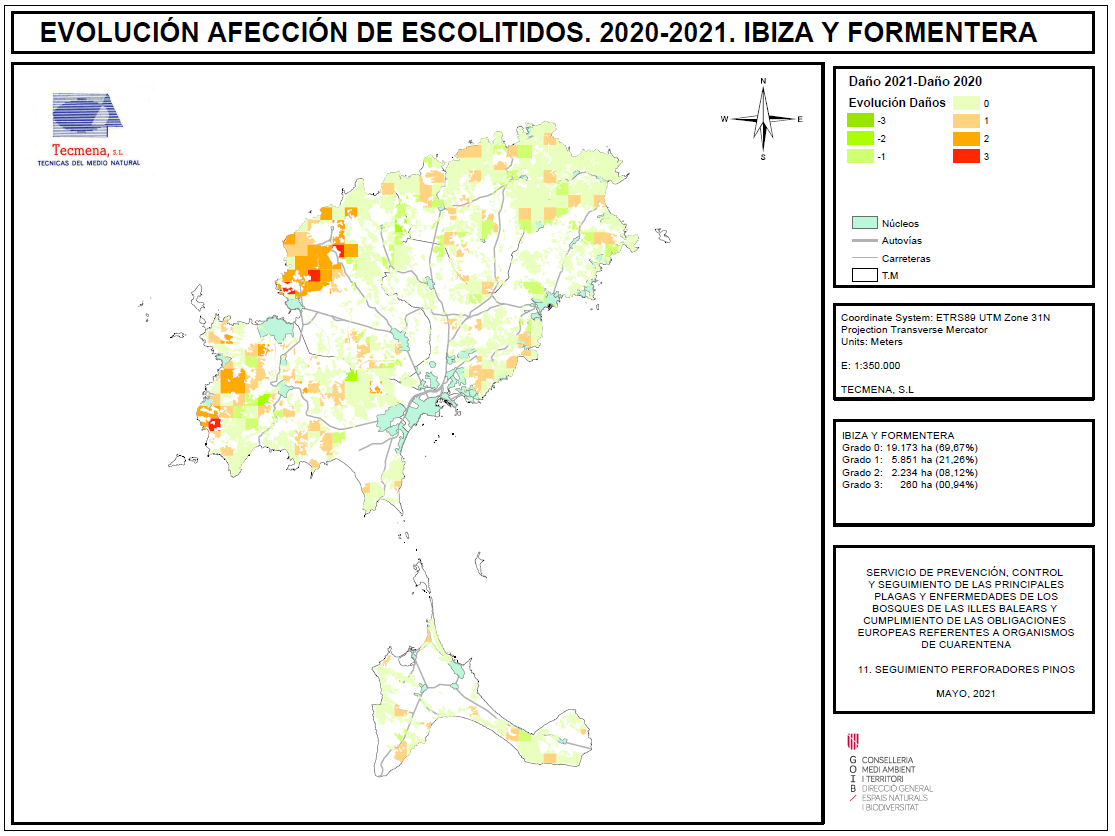 Mapa d'afectació perforadors pi. Pitiüses. Primavera 2021