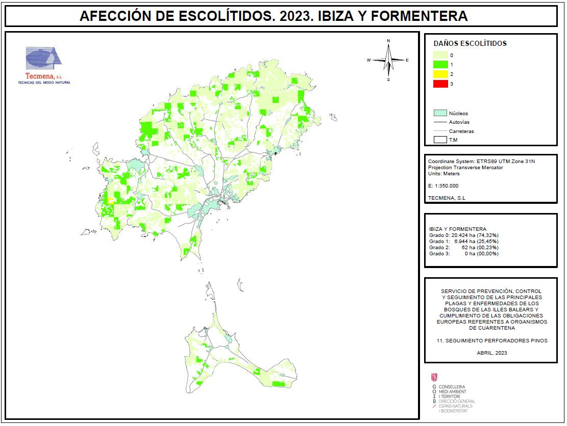 Mapa d'afectació perforadors pi. Pitiüses. Primavera 2023