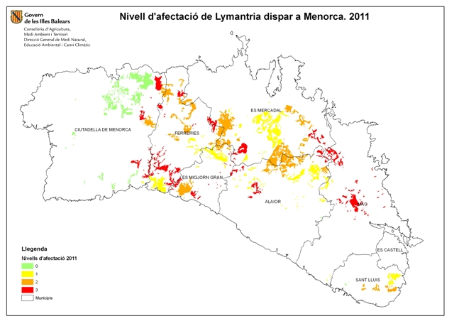 Mapa d'afectació de Lymantria a Menorca - 2011