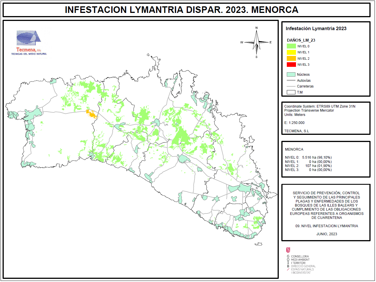 Mapa de afectación Lymantria dispar Menorca 2023