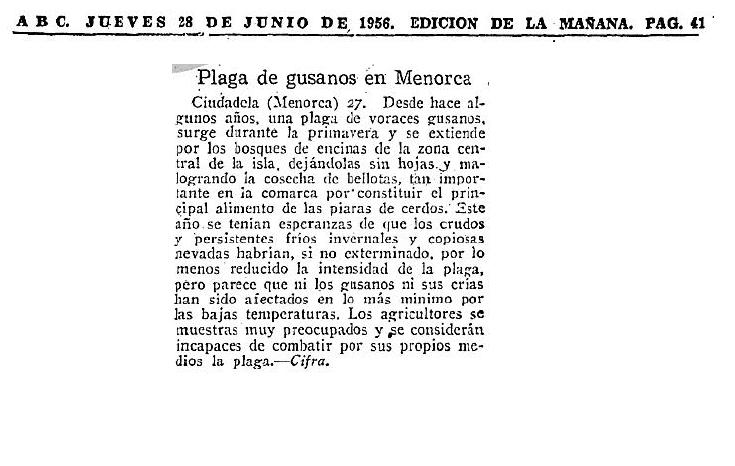 Notícia publicada en el diario ABC, jueves 28 de junio de 1956, en la página 41 de la edición de la mañana. Presumiblemente hace referencia a Lymantria dispar.