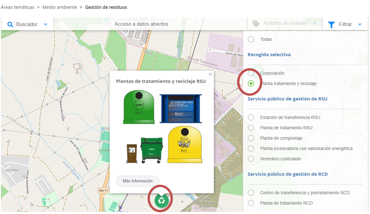 Se tiene que seleccionar el ítem “Filtrar”, a continuación “Planta de tratamiento y reciclaje” y seguidamente el círculo verde de RSU (ver imagen a continuación).