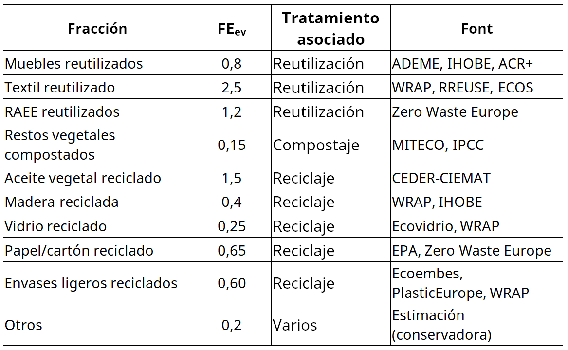 - Los factores de emisión por tipo de residuo y por tratamiento aplicado (recogida selectiva, compostaje, reutilización, etc.).