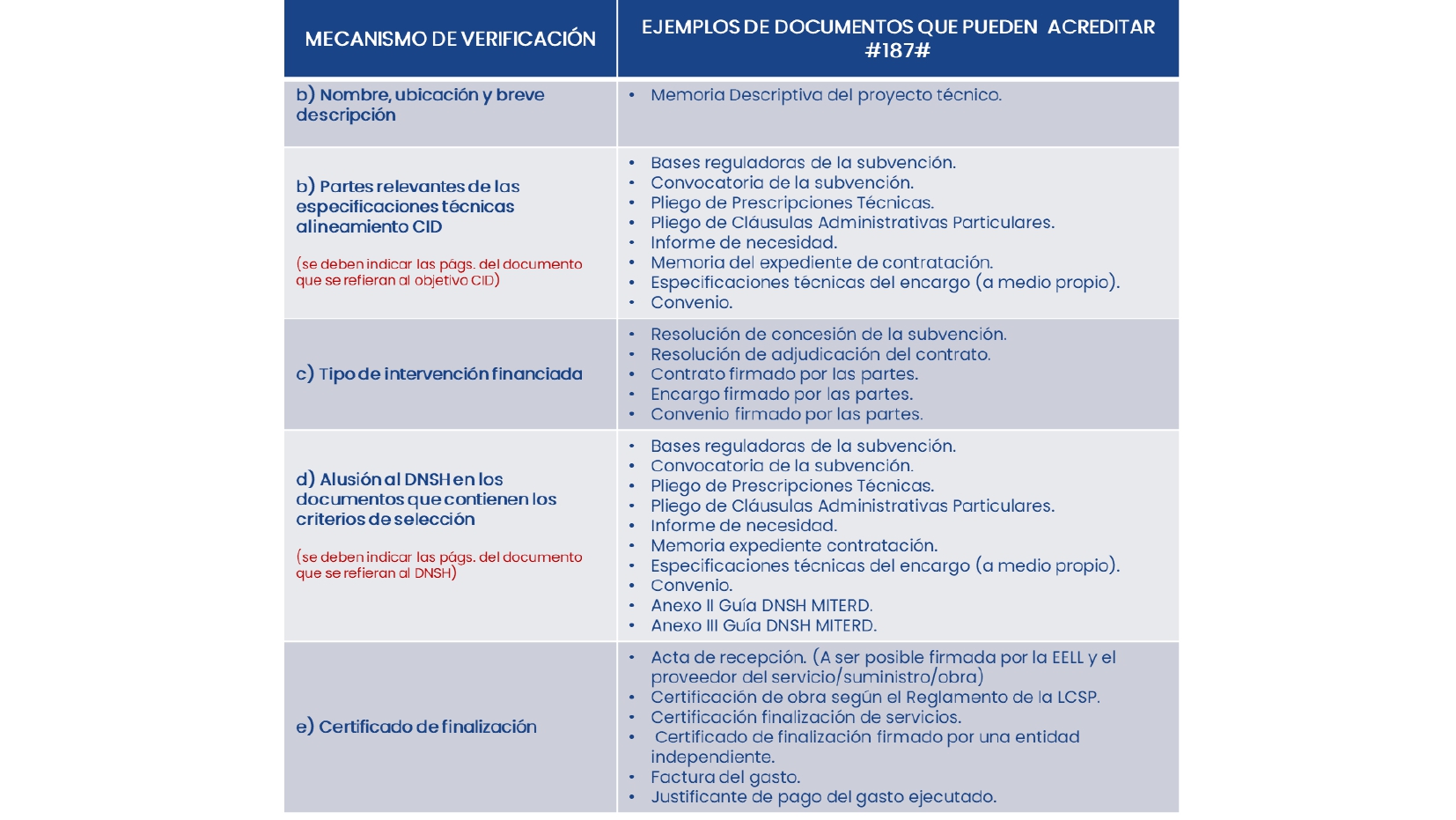 A pesar de que los Mecanismos de Verificación (MV) solo hacen referencia a la justificación “ex-ante/ex ante”, de cara a futuras revisiones y auditorías se tiene que justificar el cumplimiento del DNSH “ex post” para todos los proyectos técnicos.