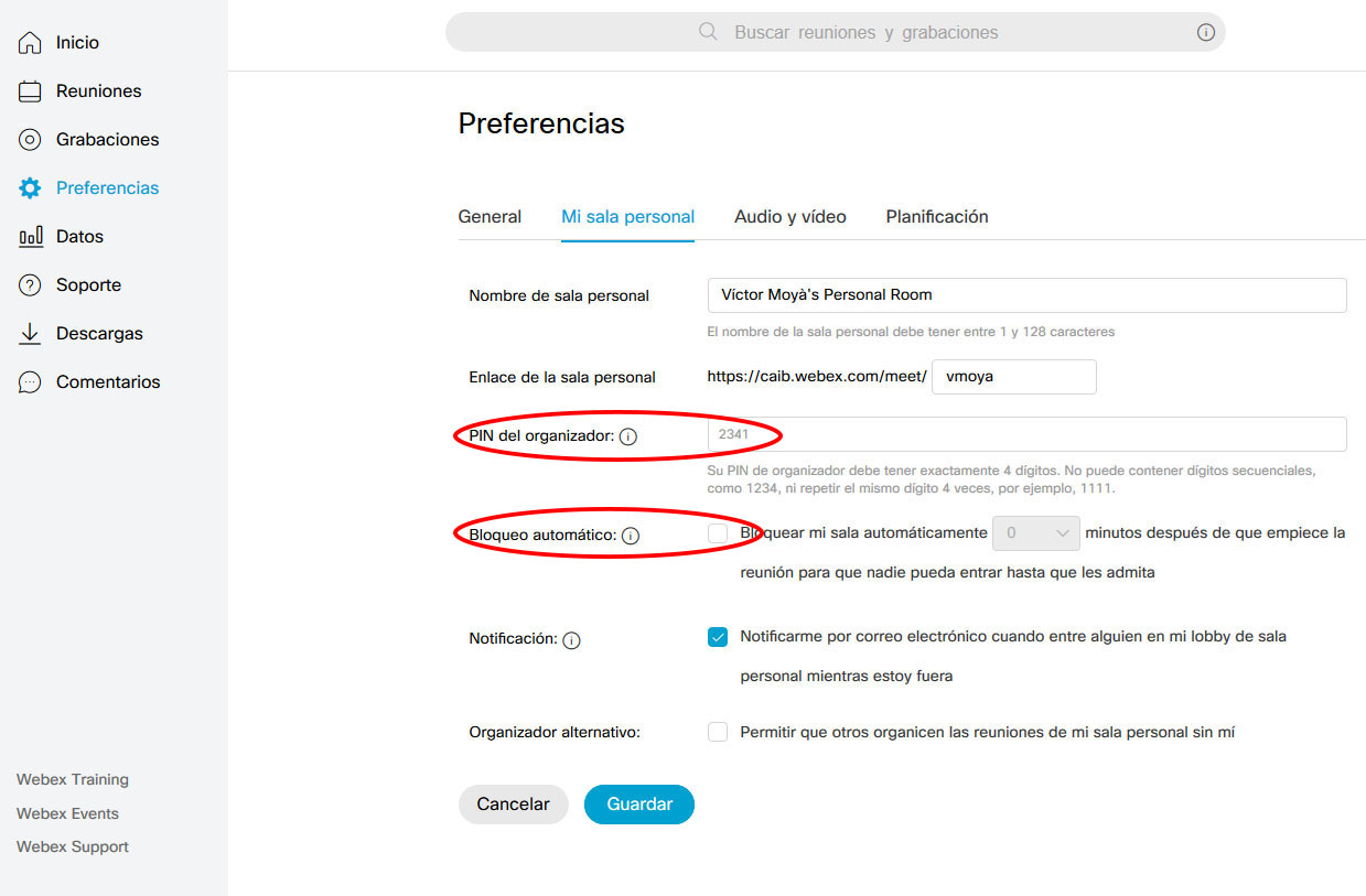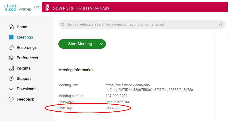 3. Una vegada connectats, per entrar a la sessió com a amfitrió, quan se'ns demani, haurem d'introduir el codi PIN esmentat abans.  En cas d'una reunió programada, el codi és de 6 xifres i el podem trobar dins el nostre compte webex, polsant damunt la referència a la reunió planificada (dins l'apartat de Reunions). Per altra part, en el cas de sala personal, se tracta d'un codi de 4 xifres (modificable) que podem podem consultar dins Preferències - Sala Personal. A les imatges següents se poden veure aquests dos casos.