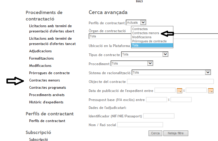 > Igualmente, tenga en cuenta que, si el órgano de contratación -aunque la cuantía del contrato esté bajo los límites máximos de los contratos menores- ha querido concurrencia abierta, aparecerá encuadrado dentro de la categoría CONTRATOS, y no CONTRATOS MENORES, dentro del filtro "Ubicación en la Plataforma".