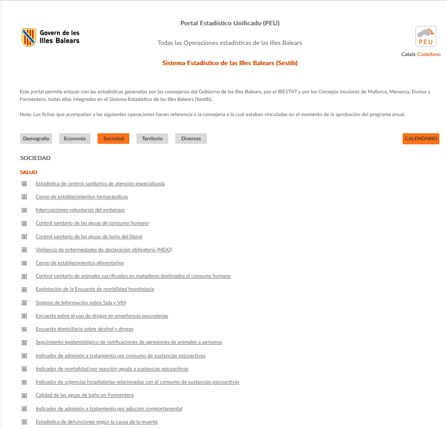 Este portal permite enlazar con las estadísticas generadas por las consejerías del Gobierno de las Illes Balears, por el IBESTAT y por los Consejos Insulares de Mallorca, Menorca, Eivissa y Formentera, todas ellas integradas en el Sistema Estadístico de las Illes Balears (Sestib).