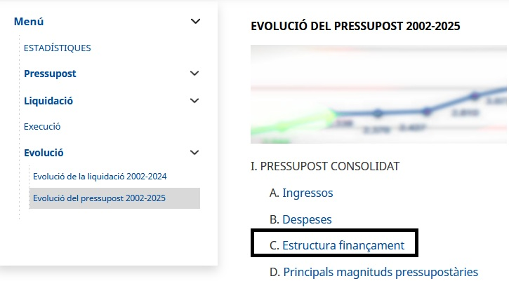 Los datos sobre la estructura de la financiación de la Comunidad Autónoma y su evolución en los últimos años se pueden encontrar en las dos páginas siguientes, concretamente en el apartado I.C. ESTRUCTURA DE FINANÇAMENT