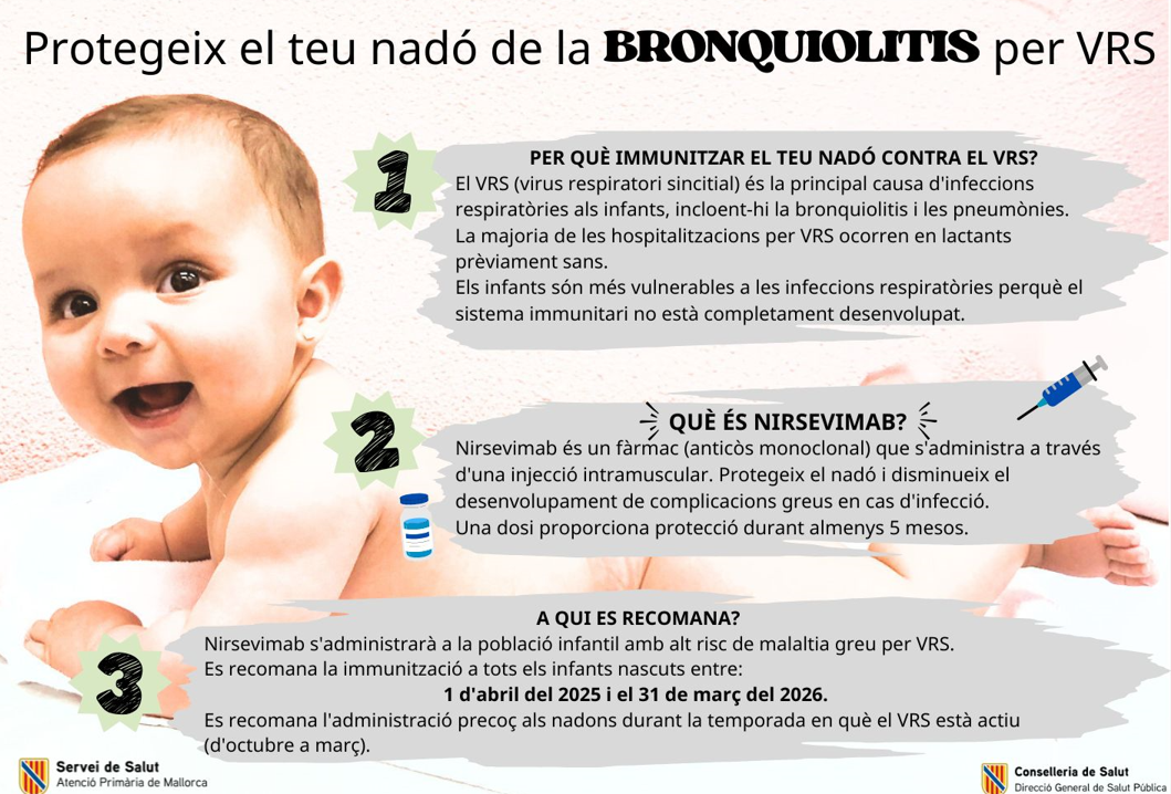 Les autoritats sanitàries en recomanen l’administració per protegir tots els infants nascuts a partir de l’1 d’abril de 2025. La Direcció General de Salut Pública de les Illes Balears posa a la seva disposició de manera gratuïta les dosis necessàries per a la immunització passiva contra el VRS de tota la població diana.